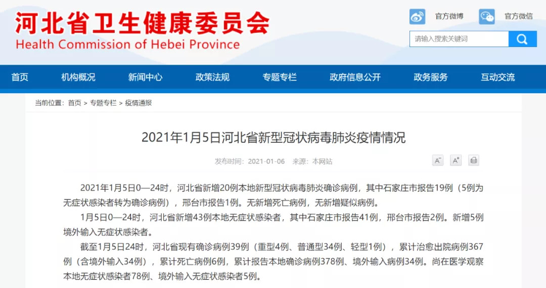 据河北卫健委统计,1月5日,河北省已经新增了20例本地确诊病例,43例无症状感染患者。